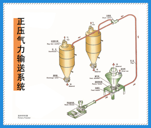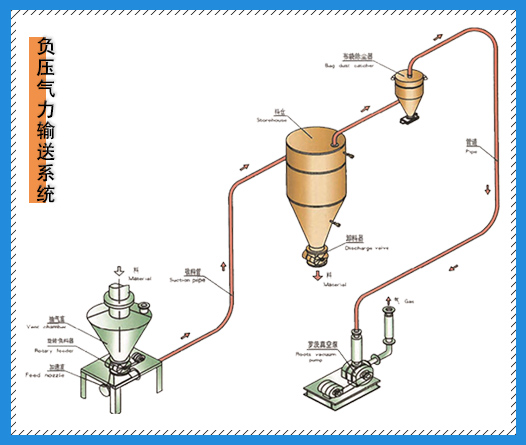 正負壓稀相輸送,料氣比大約為0~30,為粒體懸浮于氣流中,可根據(jù)正負壓各自輸送距離與產(chǎn)量來合理選定出動力源風量與風壓,亦可根據(jù)不同工況,組合成不同形式的正負壓一…